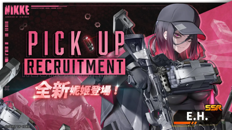 E.H.代号“风压”,所属企业为“极乐净土”,主武器为冲锋枪“向天而行”。作为唯一具备废品转化能力的火力型SSR妮姬,E.H.的核心机制为“废品收集系统”。 满足特定条件后E.H.的攻击力将得到提升。在特殊招募中,E.H.的获取概率为2%,是玩家们争相追逐的目标。